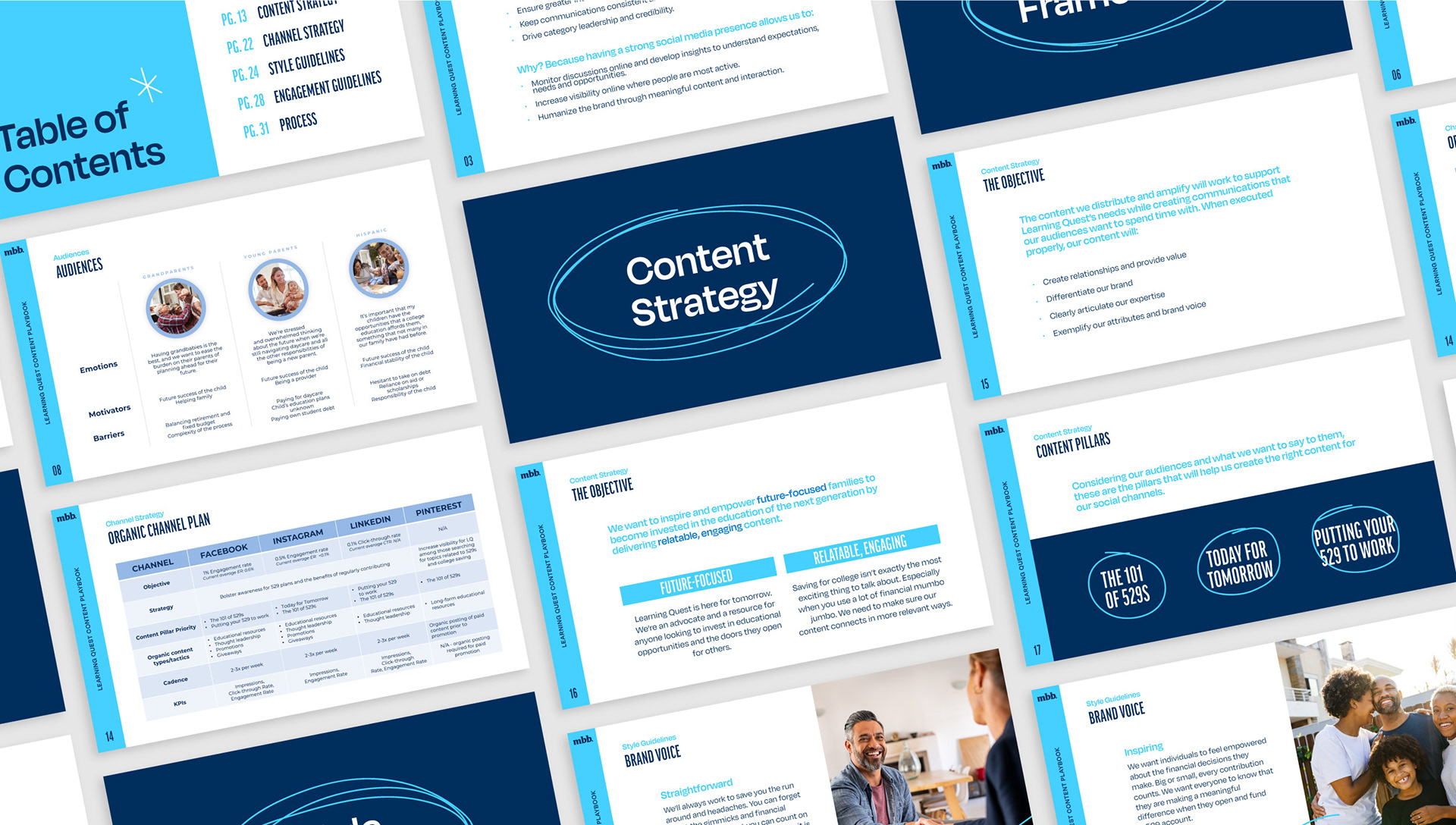 Learning Quest, a state sponsored 529 savings program, was struggling to stand out and generate account openings. The brand was stuck in the sea of marketing sameness prevalent in the financial space. To break free from this, we crafted a vibrant brand platform that sets it apart from competitors, emphasizing the idea that while you can't predict everything your children will do, you can plan for their future with a 529.